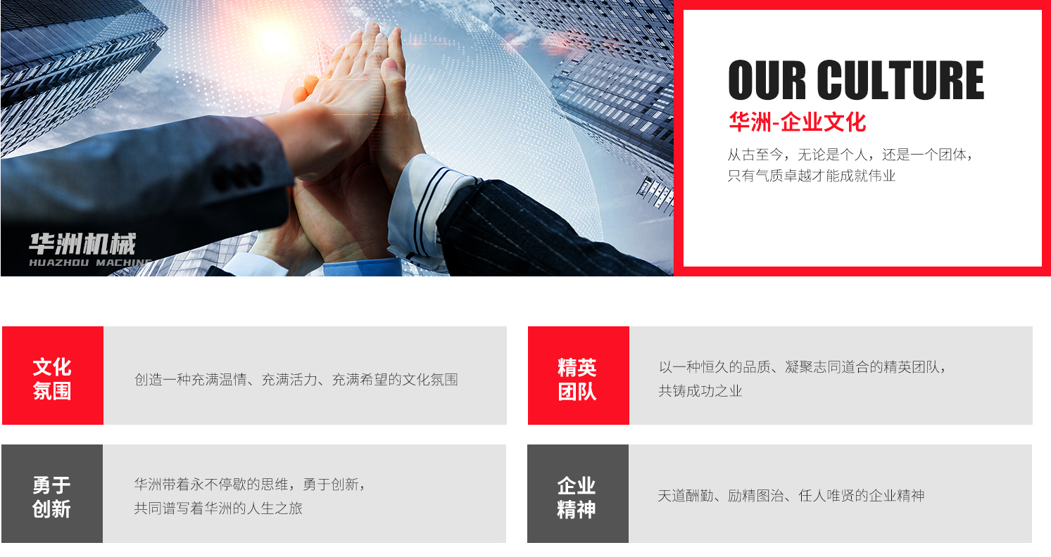 一個企業(yè),只有創(chuàng)造一種充滿溫情、充滿活力、充滿希望的文化氛圍,才能散發(fā)出獨特的性格魅力, 以一種恒久的品質、凝聚志同道合的精英團隊,共鑄成功之業(yè)。 華洲帶著永不停歇的思維,勇于創(chuàng)新,共同譜寫著華洲的人生之旅。天道酬勤、勵精圖治、任人唯賢的企業(yè)精神,創(chuàng)造學習型組織,用激情演繹精良,用勤奮推動機械事業(yè)的迅速發(fā)展。